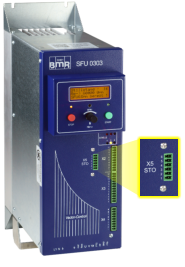 Frequency converter for sensorless operation of AC- and BLDC spindles Rotational speeds up to 240000 Upm (4000Hz) Continuous output power: 3600VA / S1-100% at 230V net 2000VA / S1-100% at 115V net Adjustable intermediate circuit realizes highest efficiency on board 200W chopper resistor Safe Torque Off (STO) according to EN60204-1 and Stop-Category 0 according to IEC 61800-5-2