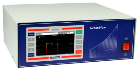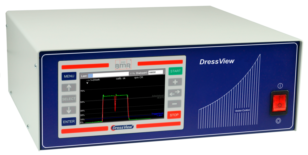Dieses Abrichtystem ist das weltweit Erste, welches sensorlos arbeitet und den Vorteil hat , dass es ohne irgendwelche Sensoren in der Spindel auskommt und daher auch preisgünstigere Spindeln für das Abrichten verwendet werden können.DressView®wird zusammen mit einem Frequenzumrichter in einem Tischgehäuse als integrierte Lösung angeboten sowie als Stand-Alone Lösung als getrenntes System, was sich besonders für den Einsatz im Schaltschrank anbietet. (Hier ist dann der Frequenzumrichter und eine Dockingstation für das DressView® verbaut.)Das aus dem Betrieb der Spindel abgeleitete Signal wird graphisch auf einem LCD-Display dargestellt. Zur Signalausgabe an die SPS kann jeweils ein Grenzwert für die Signalerfassung und zusätzlich ein höherer für eine potentielle Crash-Erkennung eingestellt werden.Bei der Überschreitung des Grenzwertes wird das Mess-Signal rot eingefärbt und ein entsprechender Ausgang geschaltet.Das DressView®-System ist über seitlich angeordnete Folientasten mit deutlichem Schaltpunkt sehr einfach bedien- und einstellbar. Für den Abrichtprozess können vielfältige Einstellungen vorgenommen werden, wie z.B. das Nachleuchten der letzten Messvorgänge als Schattenbilder, die Zeitbasis der Darstellung oder die Skalierung der Anzeige. Zur Kommunikation mit der SPS stehen 3 Digitaleingänge, 3 Digitalausgänge und ein Analogausgang zur Verfügung. Hierüber kann das System gestartet und der aktuelle Status ausgegeben werden. Der Analogausgang gibt direkt das Mess-Signal des Abrichtvorgangs aus.Tests zeigen, dass es in der Sensibilität und Feinfühligkeit mit den etablierten Sensor-basierten Verfahren auf Augenhöhe liegt. In Versuchen wurden beim Abrichten Genauigkeiten von unter 0,5 µm realisiert